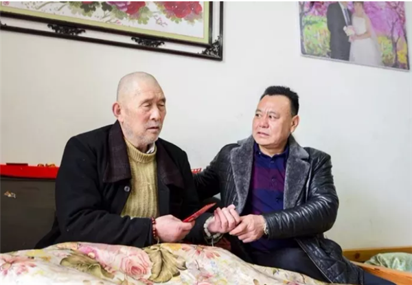 崔巨发(右一)慰问双目失明、卧病在床的赵德忠,送去慰问金及生活用品。