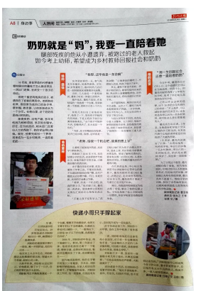 那是个腿部有残疾的孩子,被遗弃在了初春的寒风中。她将他捡起来,抱回家当成自己的孙子带,喂米糊、教走路,让他渐渐成长为一个少年。在他心里,这个奶奶就是自己的“妈妈”。