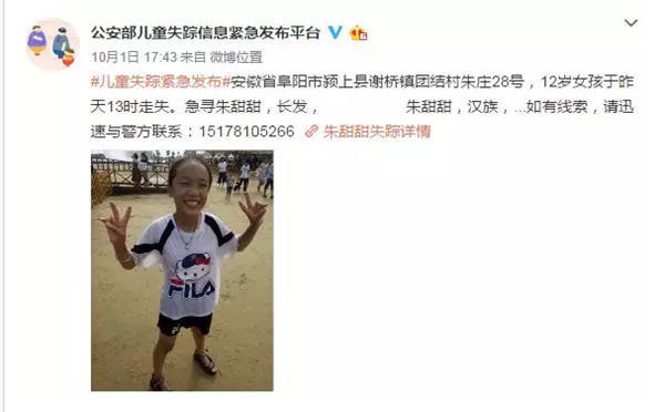 朱甜甜,汉族,女,12岁,体重70斤左右;住址:颍上县谢桥镇团结村朱庄子;