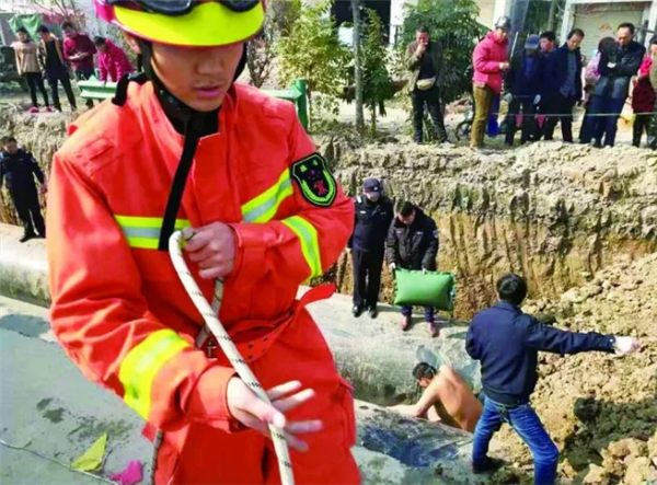 一男子不小心掉进深坑,20多名救援人员其用力,终将男子拉出坑。11月26日,阜阳市颍泉区循环园区国祯加气站附近,一名300斤左右男子落入3米深坑被困。辖区消防、公安等9人使出全部力气才将他挪到担架上,