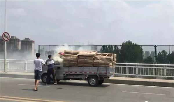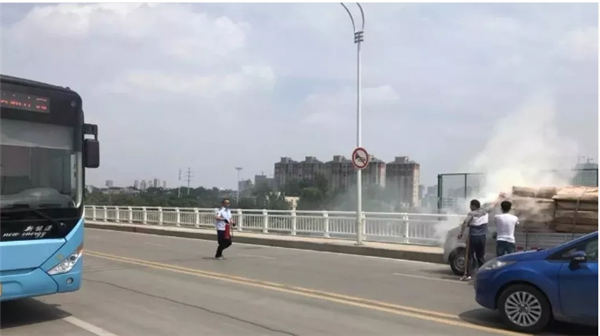 6月10号下午1点30分左右,北京路立交桥上,一辆货车货物突然起火!,货车后方行驶的市民刘红军,赶紧提醒货车司机停下进行扑救,并迅速拿出后备箱的灭火器。一路公交车开到这里,驾驶员范虎也立刻加入救火。“
