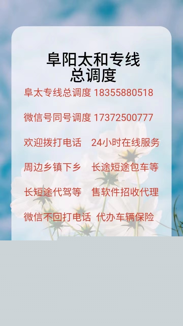 《阜太专线车队》阜阳~太和往返豪华轿车专线车队,阜城唯一一支的专业车队。解除每位乘客旅途乏味,疲劳的传统乘车理念。专为时尚及商务人士打造。因为用心。所以专业。安全!方便!快捷!以客户为中心!每天24小时!随叫随到!每天循环发车!全程高速!承接全国包车服务!周边乡镇等!阜阳太和城区调度 合肥等 18355880518 17372500777
